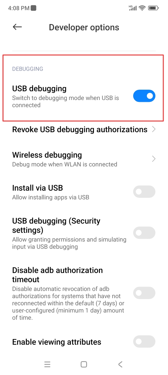 - Search ”phone model+ developer mode open+ USB debug enable“ on Youtube for guide